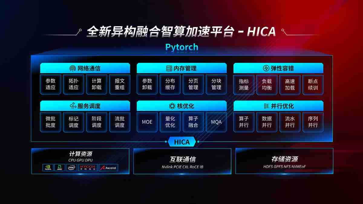 通过自研的服务层、、、、中间适配层、、以及调度编排算法,,,,采用数据并行、、、模型并行等多种并行方式,,,,把并行计算任务进行有效的分解,,,,使其分别由相应的软件栈和算力资源来承接。。。。当GPU资源变化,,,HICA可以实时动态调度计算子任务并调整模型拓扑和架构,,以充分聚合各种算力资源。。