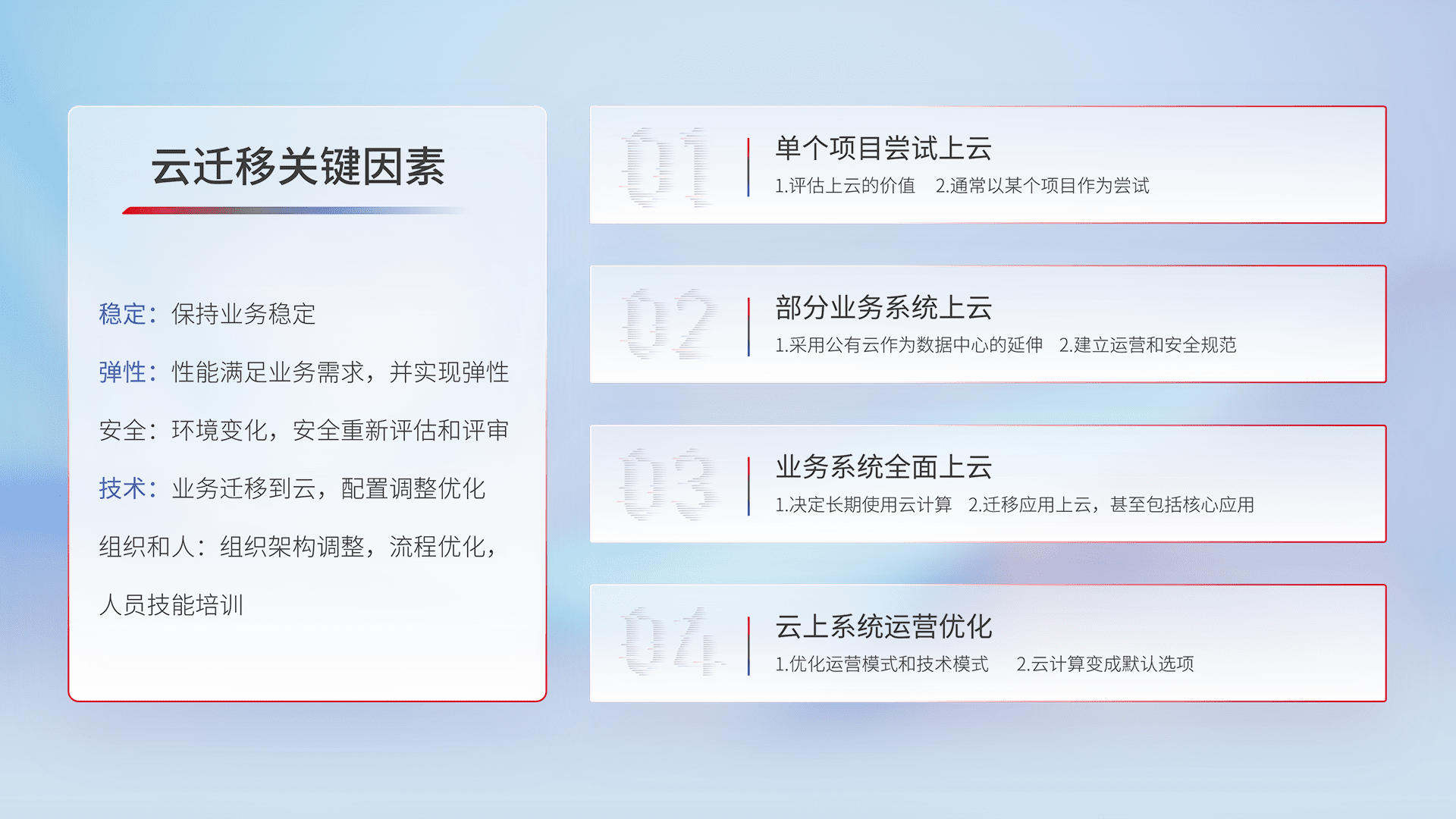 结合实际业务,,从规划设计、、云平台选型、、、、云原生改造、、数据迁移、、、集成交付,,迁移全过程为客户识别最佳上云路径,,,,做好风险识别管理,,设计网络架构、、身份权限、、安全审计合规、、操作审计、、、日志审计、、、、监控告警策略、、多站点容灾设计等,,,对云上基础设施进行整体规划,,,,提升IT治理水平,,,以满足弹性、、、高可用、、、、高性能的需求。。。。