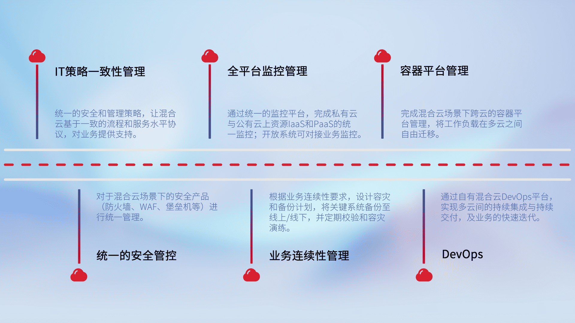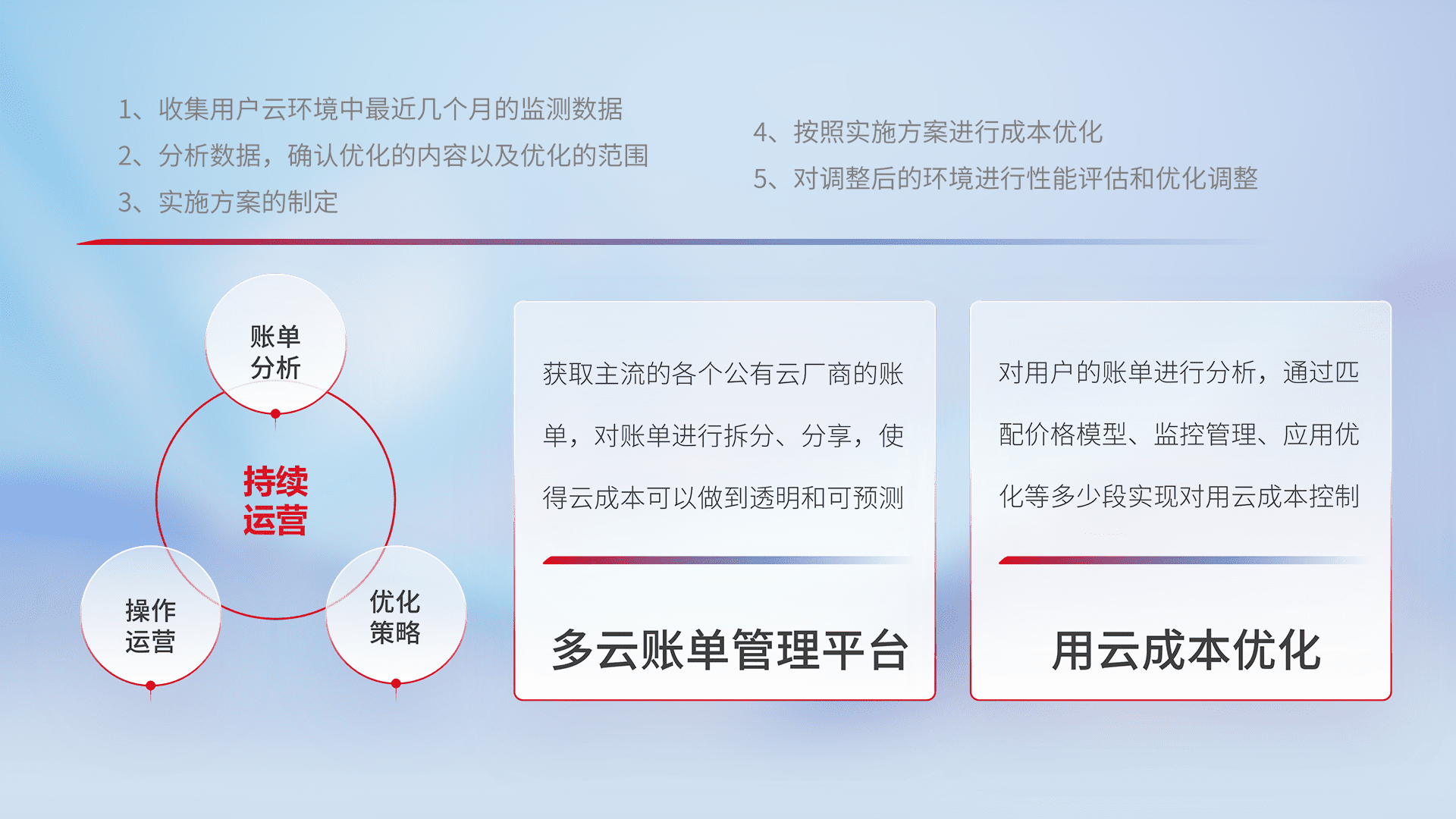 通过多云纳管,,,,以统一的资源数据模型把客户的云资源进行抽象和封装,,进而实现对多云资源的统一操作,,保障云资源管理的可靠性、、、稳定性与可用性。。量身定制化运维内容,,,,配置、、、开发运维、、补丁管理、、、、备份、、、、监控、、、认证和访问管理、、、、审计和日常巡检等,,,,保障在用云过程中的可靠度,,稳定度以及高可用率。。。。