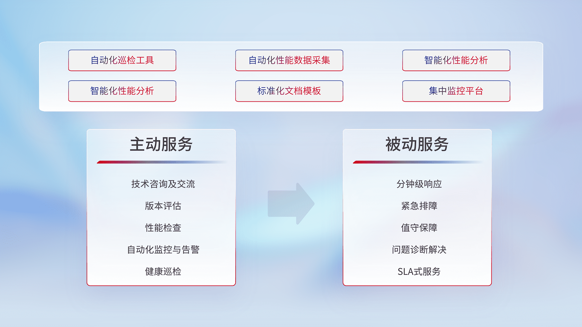 智能化工具和标准化文档,,,保障服务质量,,,,提供主动服务(包含技术咨询、、版本评估、、、性能检查、、自动化监控与告警、、、、健康巡检)和被动服务包含(分钟级响应、、、紧急排障、、、值守保障、、问题诊断解决、、SLA服务)。。