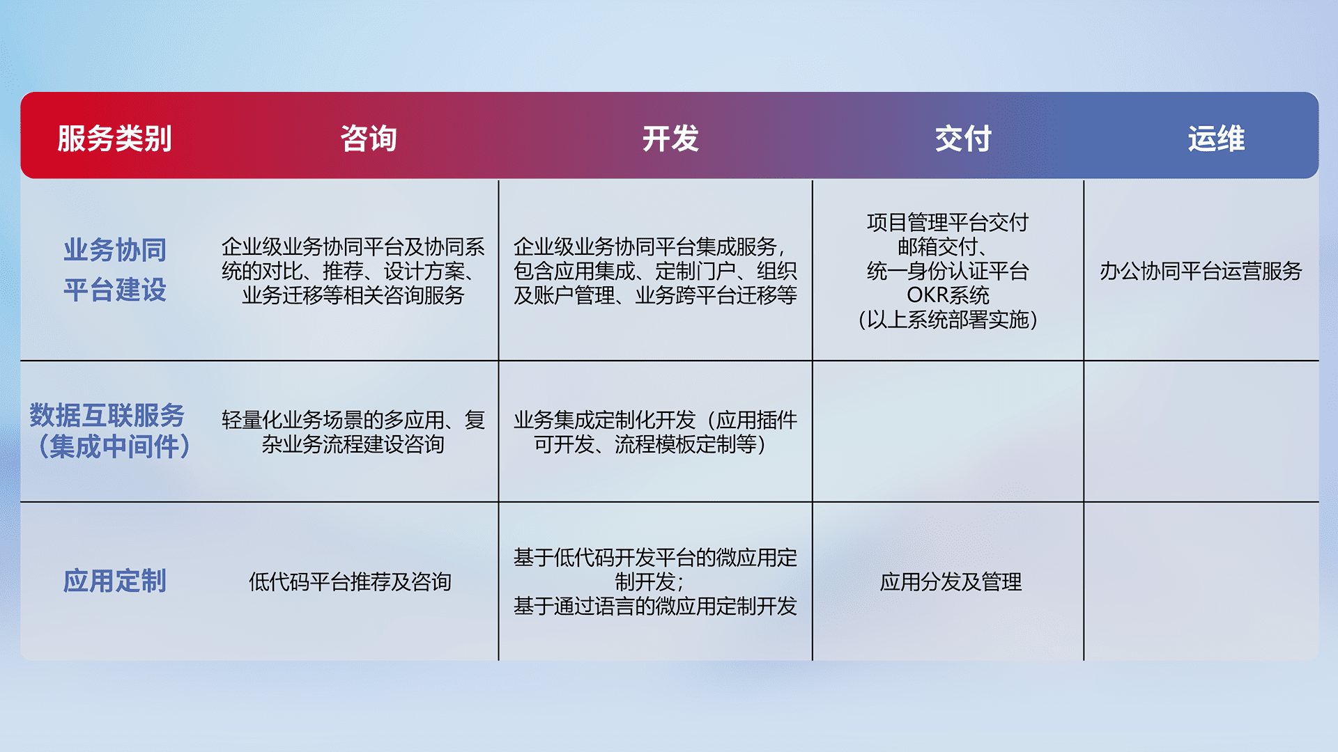 针对钉钉、、、、企微、、IDaas等平台级产品提供产品的规划、、方案、、交付、、定制化开发等服务,,,,实现如统一协同办公、、智能客户服务、、、混合会议管理、、智能数据查询、、、等业务场景,,实现数字化转型。。。